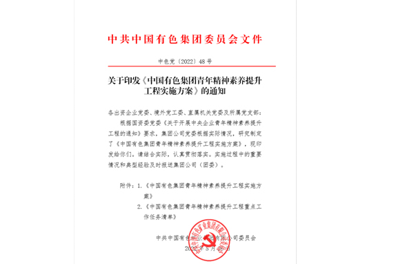 根據國資委黨委《關于開展中央企業青年精神素養提升工程的通知》要求,集團公司黨委根據實際情況,研究制定了《中國有色集團青年精神素養提升工程實施方案》。